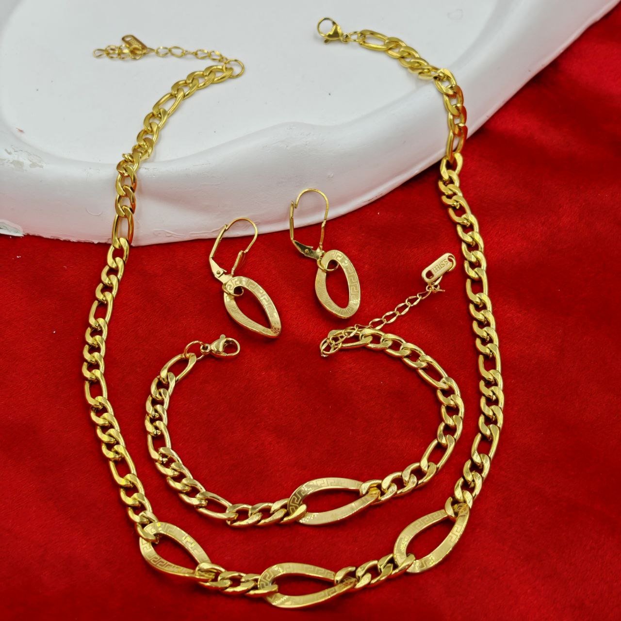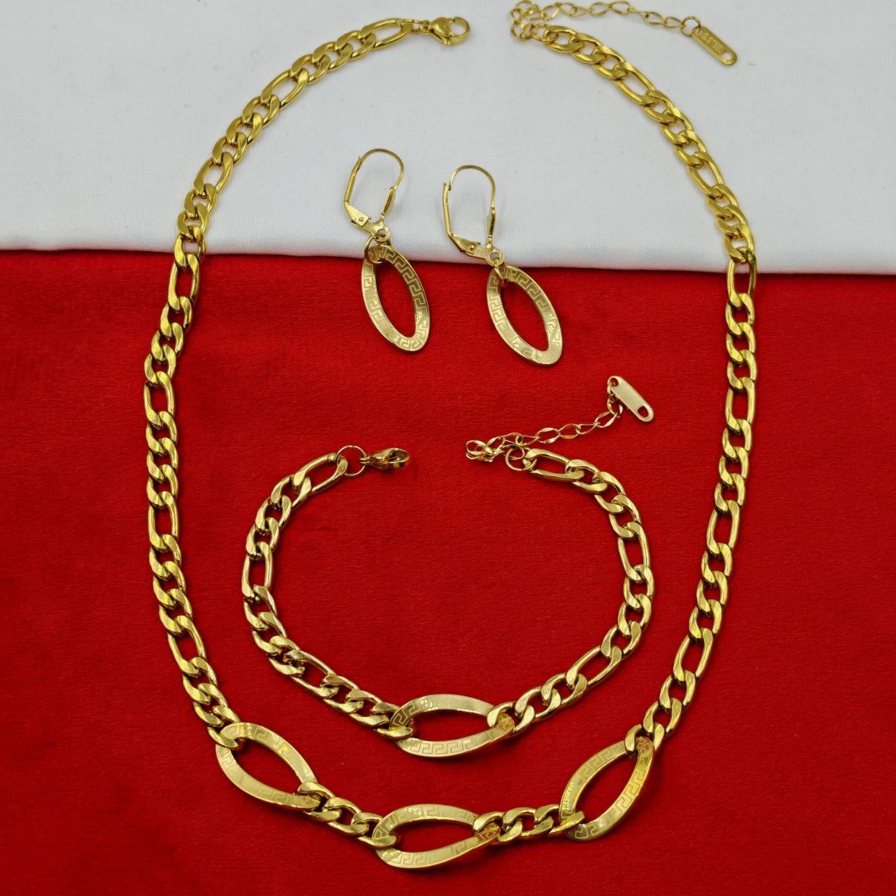 Set collier + bracelet + boucles dormeuses au design gourmette ponctué de maillons ovales gravés (inspiration grecque). En acier inoxydable 316L avec finition dorée 18K : éclat durable, résiste à l’eau, hypoallergénique — chic et facile à porter du quotidien aux soirées.